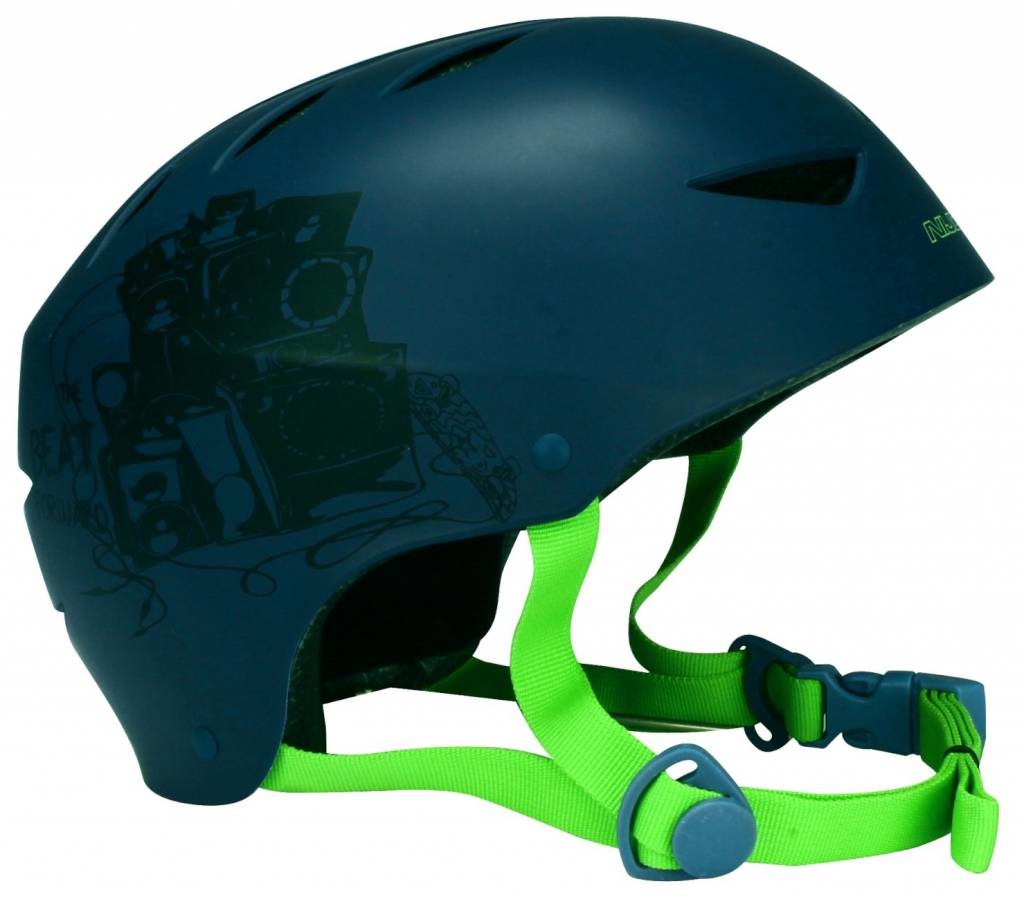 | Model | ABS buitenzijde met print, matte afwerking, ventilatiegaten aan boven-, voor- en achterzijde van de helm, EPS binnenzijde, passtukken, verstelbare polyamide kinband met snelsluiting, band langs nek/achterhoofd verstelbaar d.m.v. draaiknop |
